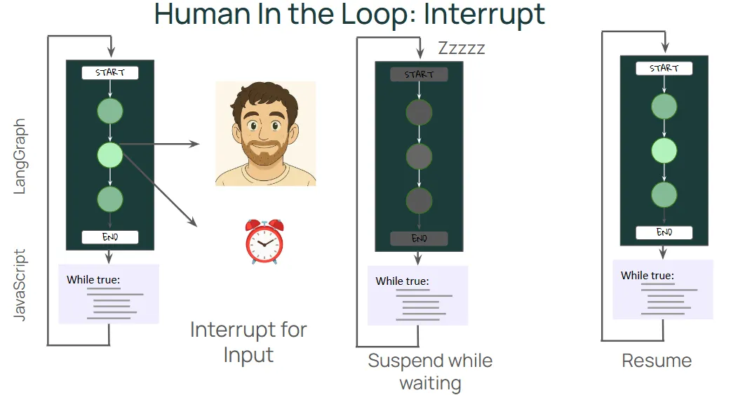 하지만 경우에 따라 그래프가 외부 입력을 읽어야 하는 경우가 있는데, 예를 들어 도구를 실행하거나 데이터베이스에 쓰기 전에 사람의 승인을 받아야 하는 경우가 있다. 사람의 응답에는 시간이 걸릴 수 있으므로, 대기하는 동안 작업을 일시 중지했다가 정보가 제공되면 다시 시작하는 것이 이상적이며, 이러한 경우에 인터럽트가 사용된다.