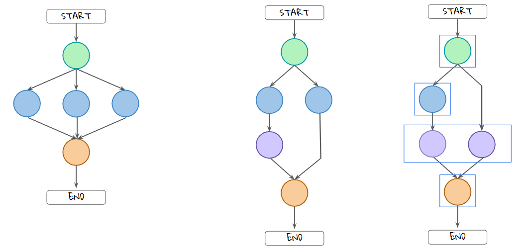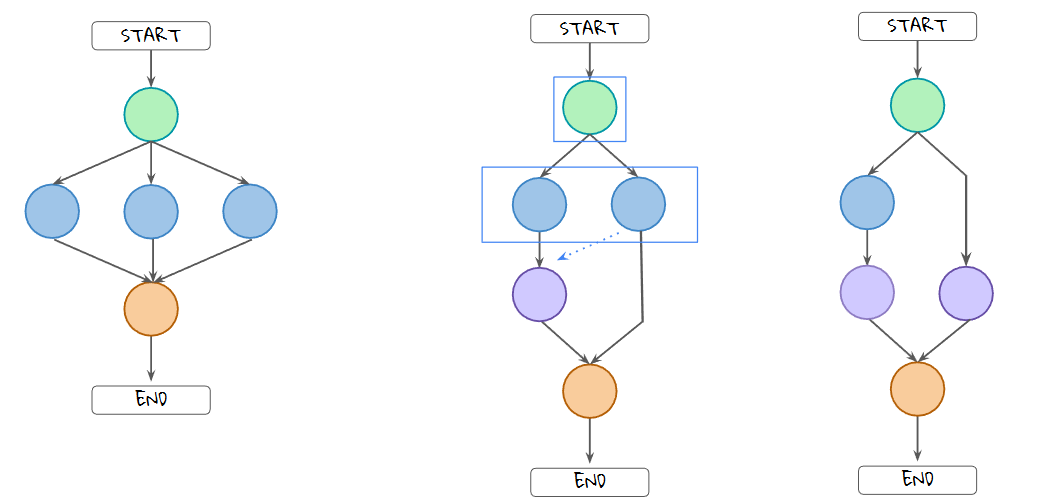 가운대와 같이 경로의 길이가 다른 경우 LangGraph에서는 우측노드의 실행 시점을 지정할 수 있다. 일반적으로 초록 노드 완료시 활성화되고, 보라색 노드의 입력으로 사용될 수도 있으나,