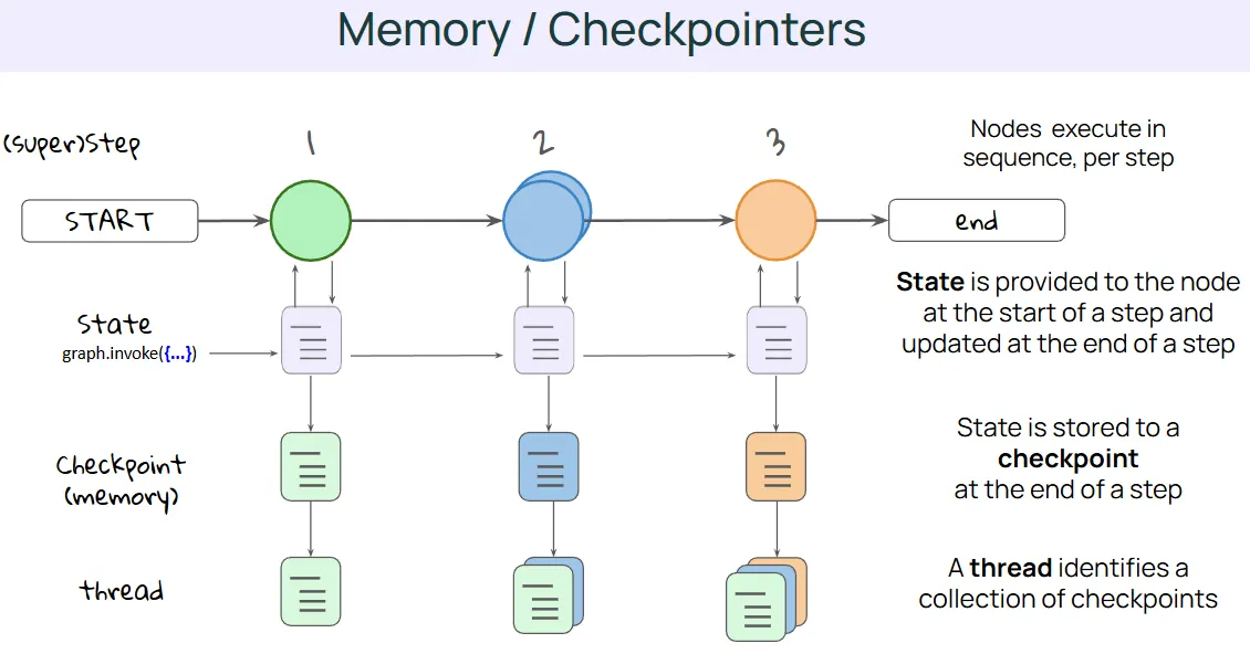 - 메모리를 설정할 때 체크포인터를 인스턴스화하는데, 여기서는 메모리 내 저장 기능을 사용했지만, 다양한 옵션이 있다. (memory = InMemorySaver() )