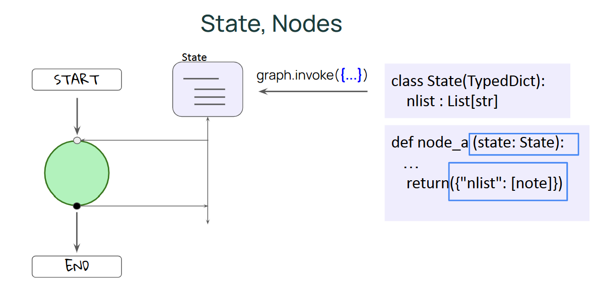 state 업데이트에는 노드의 결과를 사용하는데, 노드는 함수에 불과하기에 주요 인수는 state고 출력 또한 state에 대한 업데이트이다. (여기서는 문자열 목록에 대한 업데이트) state는 시간의 흐름과 관계없이, 노드에 오류가 발생시에도 유지될 수 있다. 따라서 실행중 노드에 오류 발생시 노드를 다시 시작하고 상태를 복원한 후 함수를 처음부터 다시 실행 가능하다.