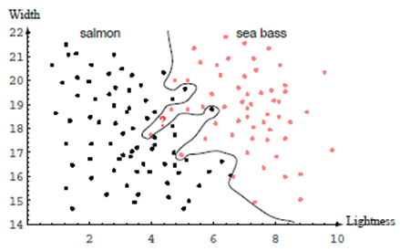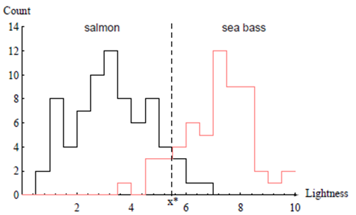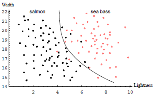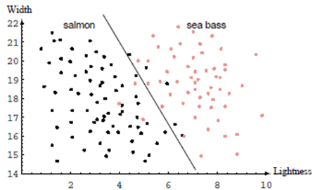 이제 문제는 이 특징공간을 두 영역으로 나누는 것이고, 한 영역의 모든 점은 Seabass, 다른 영역은 Salmon이 될 것이다.